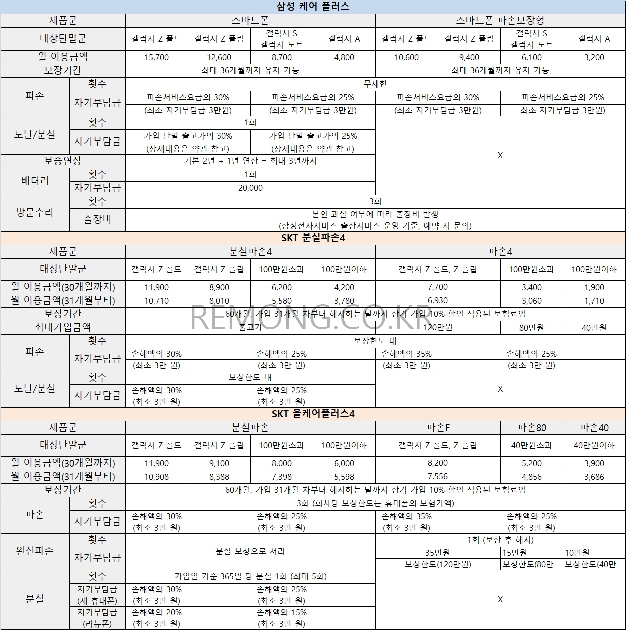 휴대폰 보험 비교 - 안드로이드 (삼성 & SKT)- Ver1.0 (remong.co.kr)
