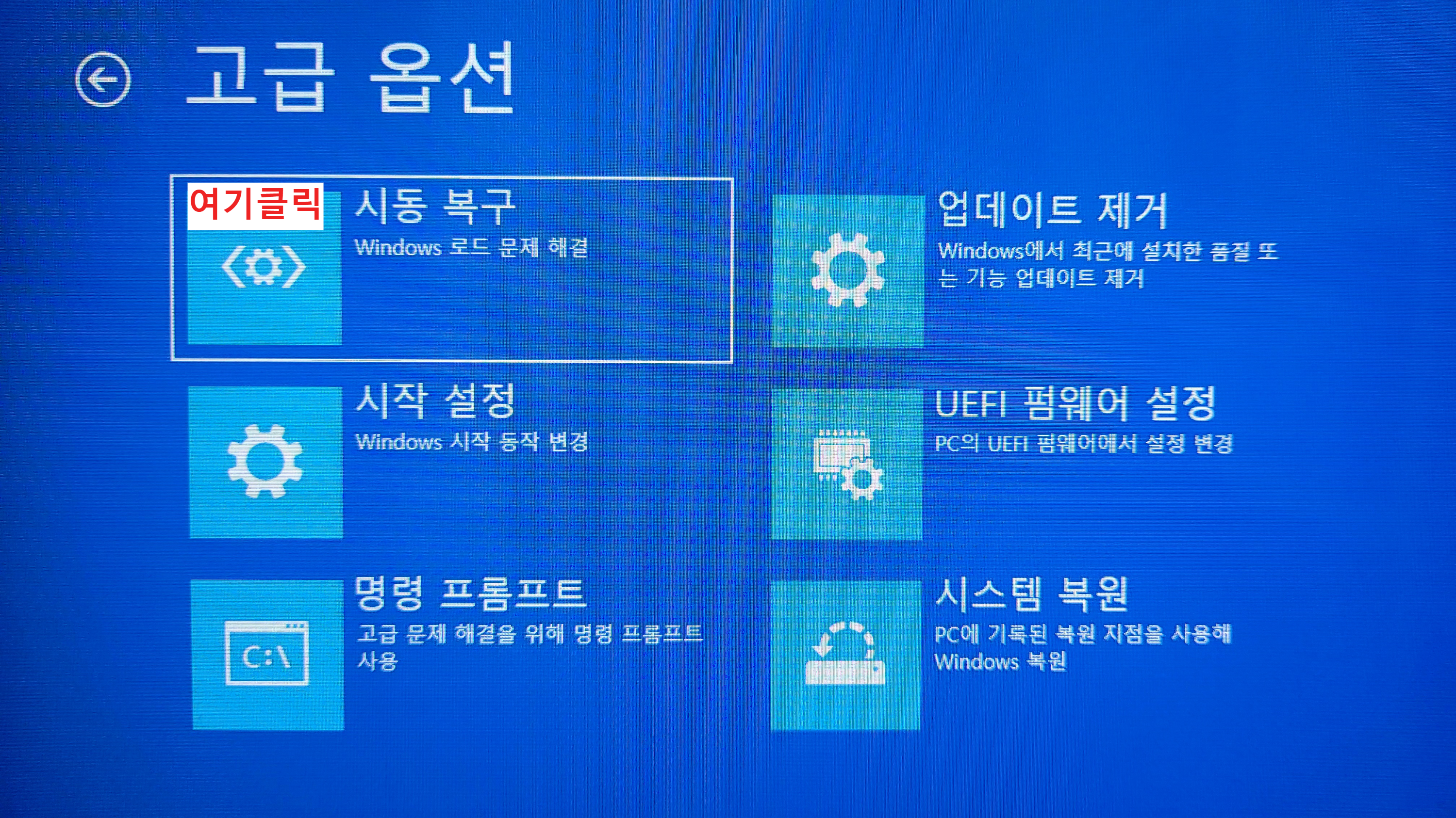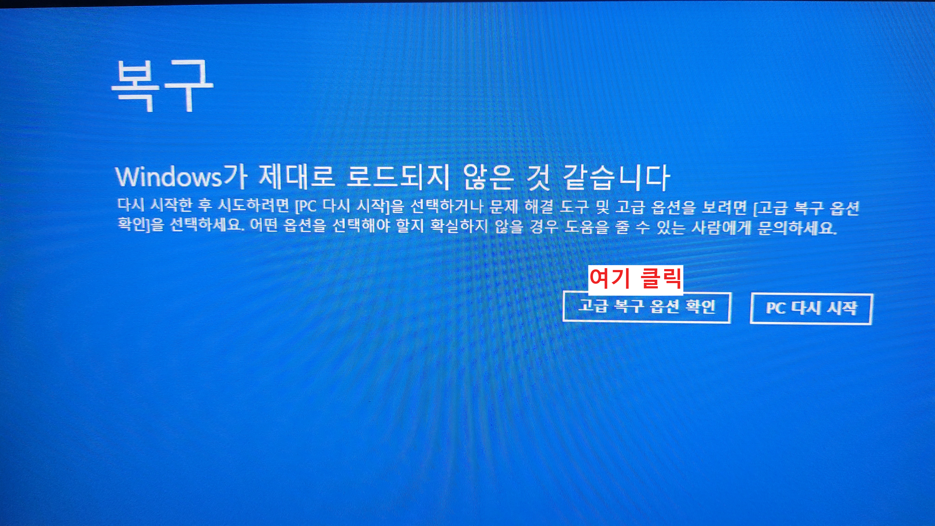 아래와 같은 화면이 계속 나오면서 윈도우가 부팅이 안된다.